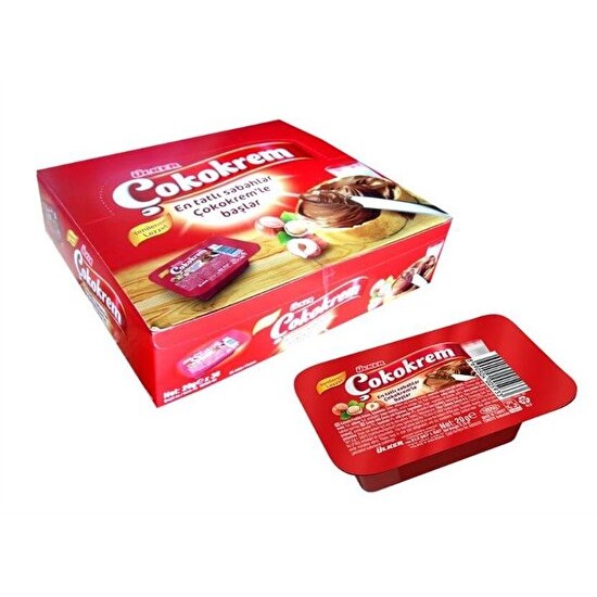 Ülker Çokokrem Kakaolu Fındık Kreması 20 g 36'lıÜrün Adı: Ülker Çokokrem Kakaolu Fındık Kreması 20 g 36'lıİçindekiler: Şeker, Bitkisel Yağlar (Palm, Ayçiçek ), Peyniraltı Suyu Tozu, Yağı Azaltılmış Kakao Tozu (%7), Fındık Püresi (%4), Yağsız Süttozu (%4), Emülgatörler (Soya Lesitini, Poligliserol Polirisinoleat), Aroma Vericiler, Tuz.Alerjen Uyarısı: Alerjen ürünler koyu renk ile belirtilmiştir.Menşei: TürkiyeÜretici Adı: ÜlkerGıda İşletmecisi ve adresi: Ülker-Kısıklı Mah. Ferah Cad. No:1 Üsküdar/İstanbulİşletme Kayıt Numarası/Onay Numarası: TR-34-K-012868Net Miktar: 20 gEnerji ve Besin Öğeleri Tablosu (Beslenme Bildirimi): 1 porsiyon (20 g) için;Enerji: 108 kcalYağ: 6,1 gDoymuş yağ: 1,7 gKarbonhidrat: 12 gŞekerler: 12 gLif: 0,5 gProtein: 0,8 gTuz: 0,08 gÜrün açıklamaları (Özel muhafaza ve/veya kullanım koşulları.): Buzdolabı dışında, ısı, koku, nem ve güneş ışığından uzakta tutunuz.000000000100014928